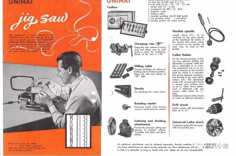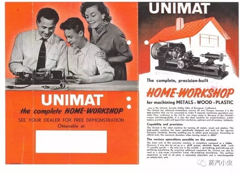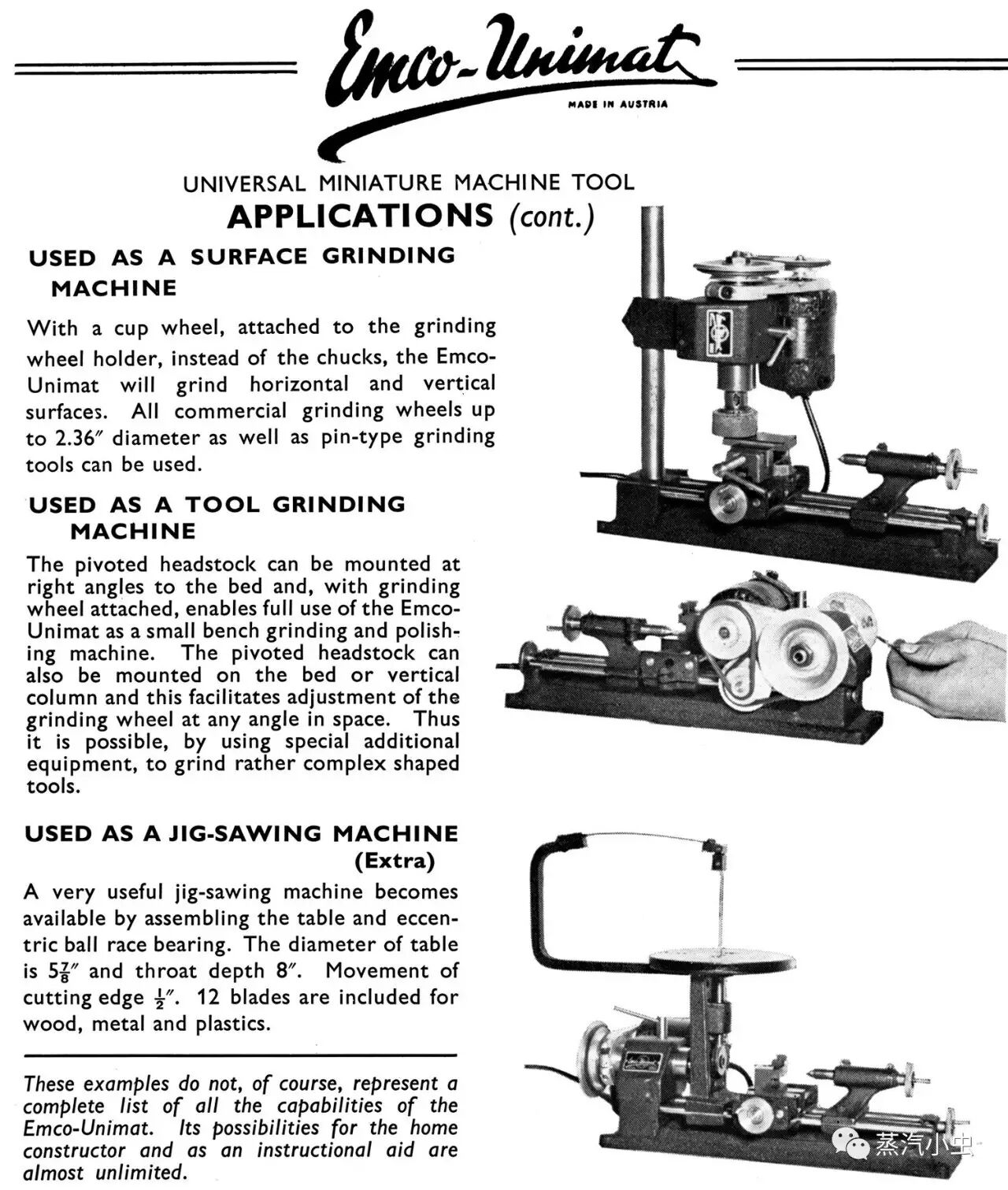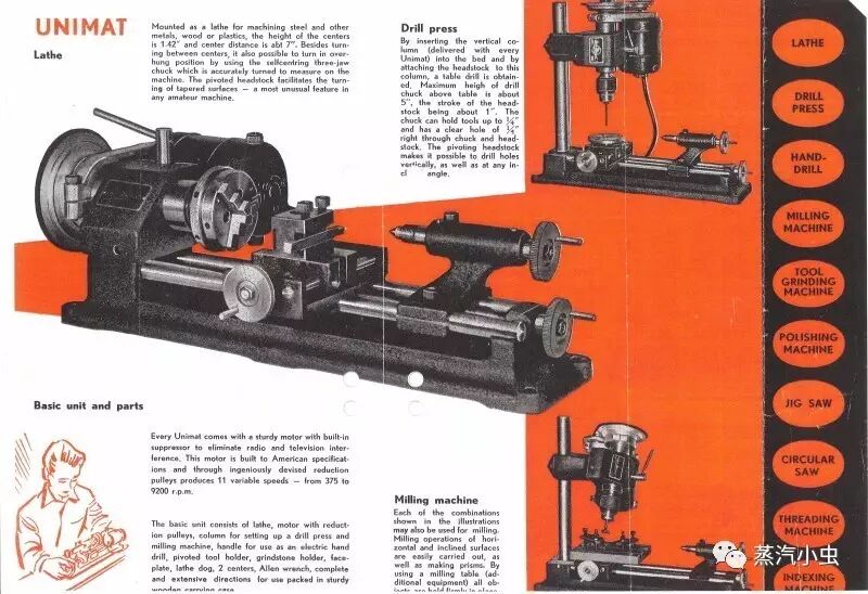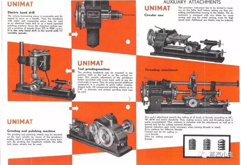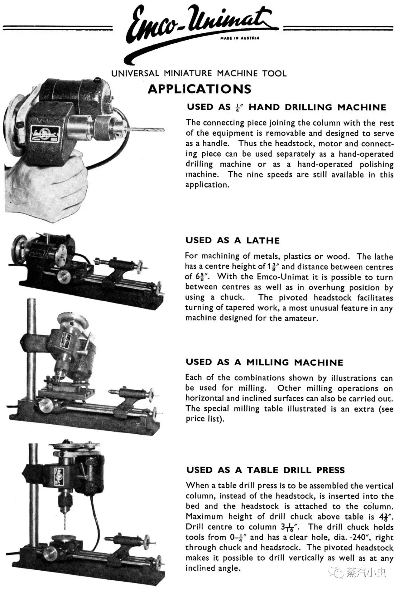 工欲善其事必先利其器,今天蒸汽小虫不谈小火车,谈谈西方玩家很喜欢的一款多功能迷你小车床。 Unimat SL(优耐美SL型)机床是由奥地利Maier&Company设计生产,北美国家称之为Unimat DB型,于1953年推出(其原型机大约产于二战结束不久后的1947年),Emco Unimat是该公司第一个非常受欢迎的小型多用途机床,尽管它体型微小,但是凭借完美的综合性能和较高的精度,可以DIY出很多的小型金属模型配件,由于该机床足够轻(基本款型约36磅重),用一只手就能提到工作台面(该机床有一个特制的原厂木箱包装)。在尺寸上基本属于钟表车床到仪表车床的过度范畴。 该型号的生产直到1977年才告停,被新型号的Unimat 3型机床取代,在量产的二十多年里共生产了约30-40万台,这个数字在单个机床型号的产量上是很夸张的。 Unimat SL型机床的设计初衷是为家庭的DIY金属模型玩家提供一个具有各种综合性能的设备,包括基本的小型车床,钻床,铣床功能,增加相应配件后也能发展出小型锯床和砂轮功能。蒸汽小虫看了看说明书后才发现当初的设计者真的是脑洞大开,把该机床的电机功能用到了无以复加的综合用途上。 奥地利Maier&Company为该机车的拓展配件发展也耗费脑筋,从车床的中心架,外带丝杠到铣床用的各种拖板,再到锯床所有的各种配件,应有尽有,没有想不到,只有没买全。 蒸汽小虫展现一下该机床的说明书(大家看看都是怎么实现各种不同功能的,注意这个说明书不是不同型号的车床,铣床,钻床,这个就是Unimat SL模型专用机床能实现的不同功能,好像变形金刚哈哈): 看完说明书,是不是觉得这个小玩意开挂了。总的说来,30多万台的产量(主要在欧美市场销售)决定了这台小机床在西方DIY玩家心中是何等地位,该机床稳稳的占据了金属模型玩家的半壁江山,至今很多的Unimat SL仍然在作响,产出一个个精美的模型零件,其中就有很多的蒸汽小火车模型配件。 说了半天,蒸汽小虫还是要回到正题,此文探讨小机床只是蒸汽小火车模型的一个制作工具,大家的DIY工具各有千秋,功能各异,各有各的优缺点。 无设备,不模型!祝大家无论自己的设备优劣,都能享受DIY蒸汽小火车的乐趣。由于做不同比例和尺寸的金属模型需要不同尺度的机床,蒸汽小虫近期也将推出主题文章,论述玩家想做的金属火车模型尺寸与所需选取的车床,铣床等工具的级别定位。 蒸汽小虫喜欢原创噢,老铁们别光顾着自己看,转发文章让更多人关注蒸汽小虫 |